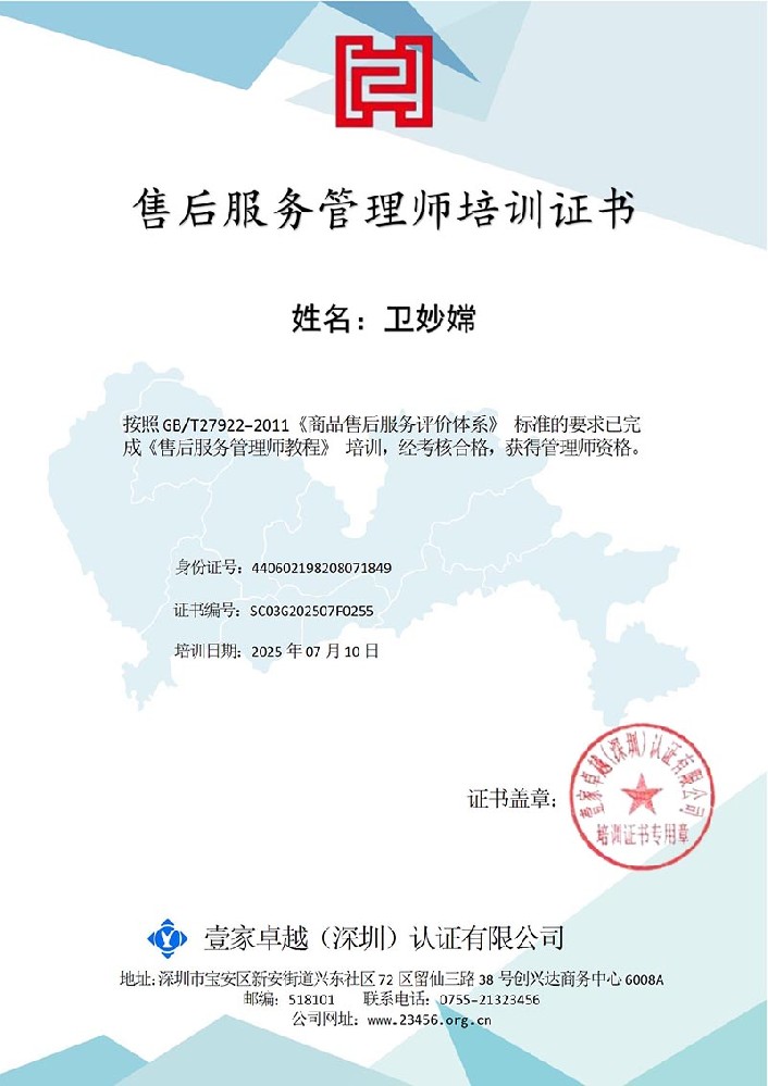卫妙嫦 售后服务管理师培训证书